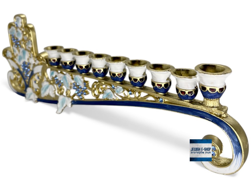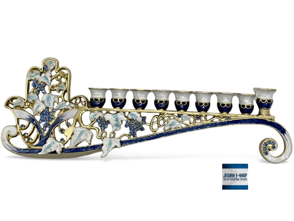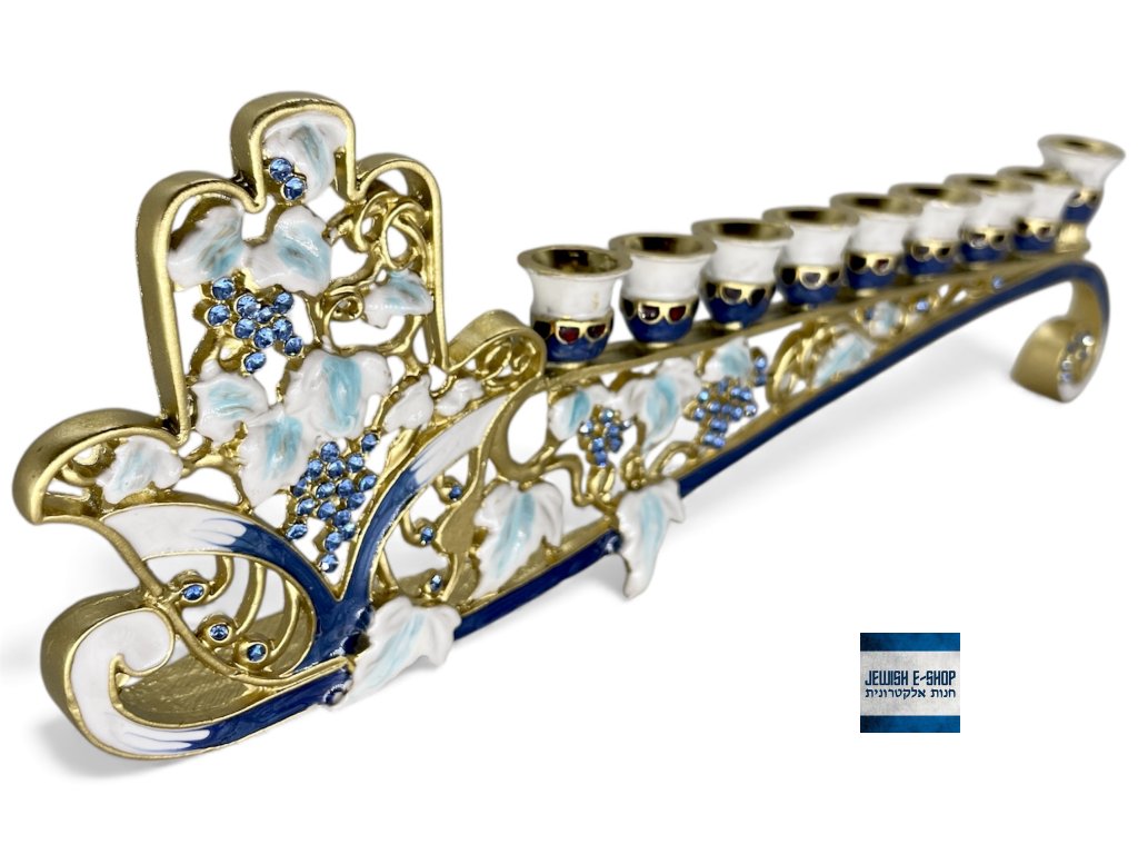 Jemně zdobená kovová chanukija s dekorem vinné révy z modrých šatonů a barevným smaltováním