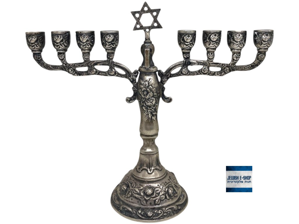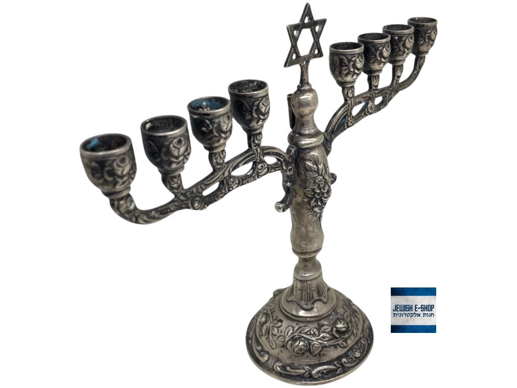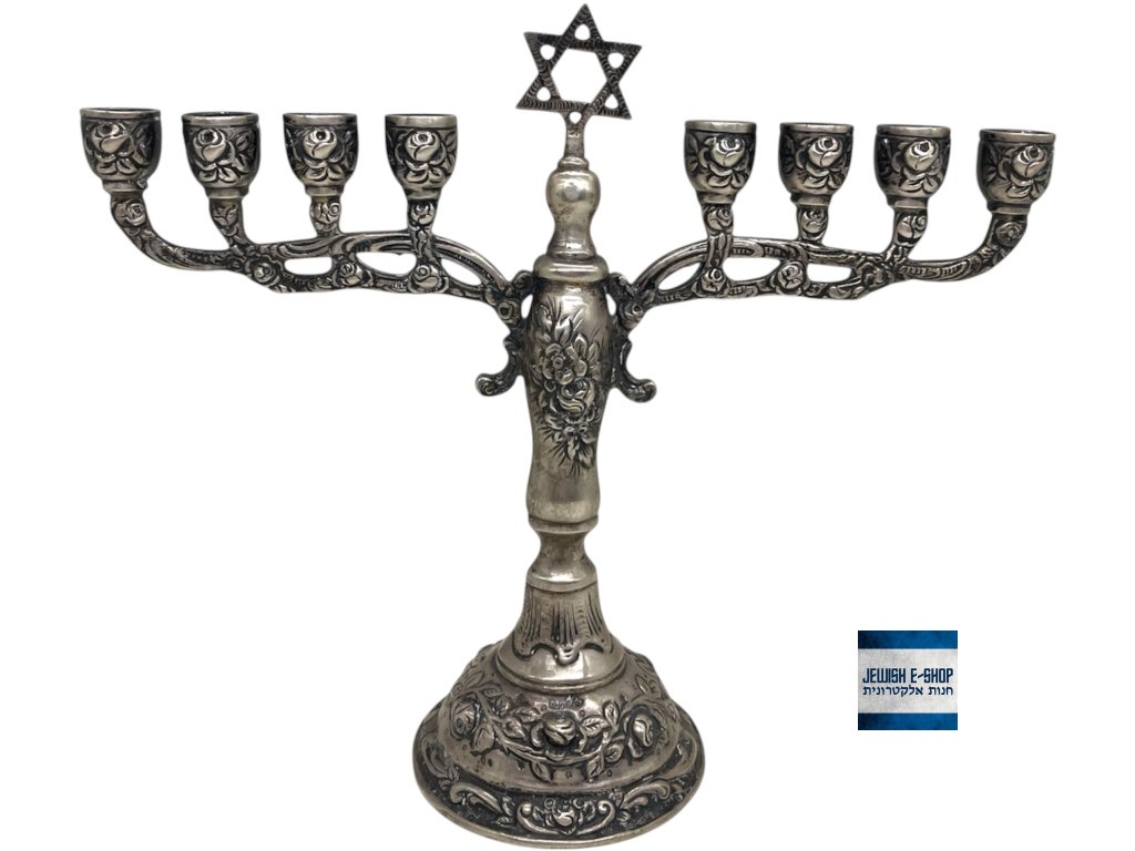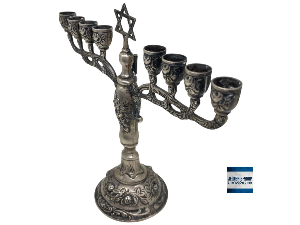 Starožitná stříbrná chanukija s florálním reliéfem ze stříbra 800