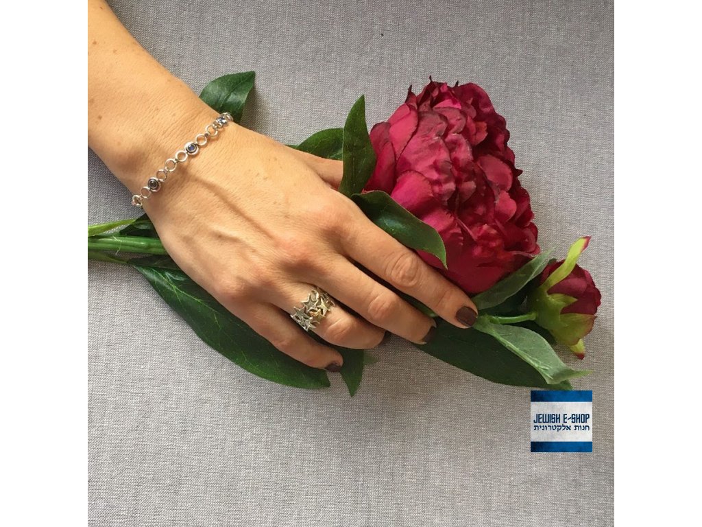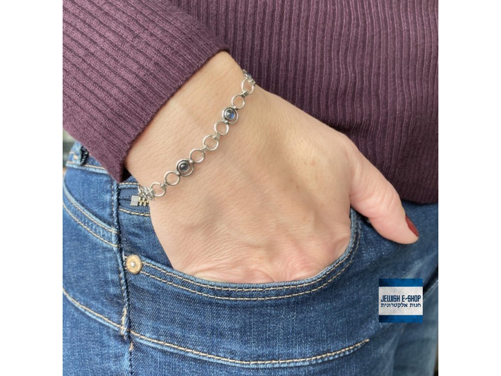 Krásný jemnější stříbrný náramek tvořený kroužky, srdíčky a kulatými kamínky. Zapínání na hrazdičku. U zapínání je zavěšena drobná kytička a štítek s nápisem ISRAEL. Kámen:...