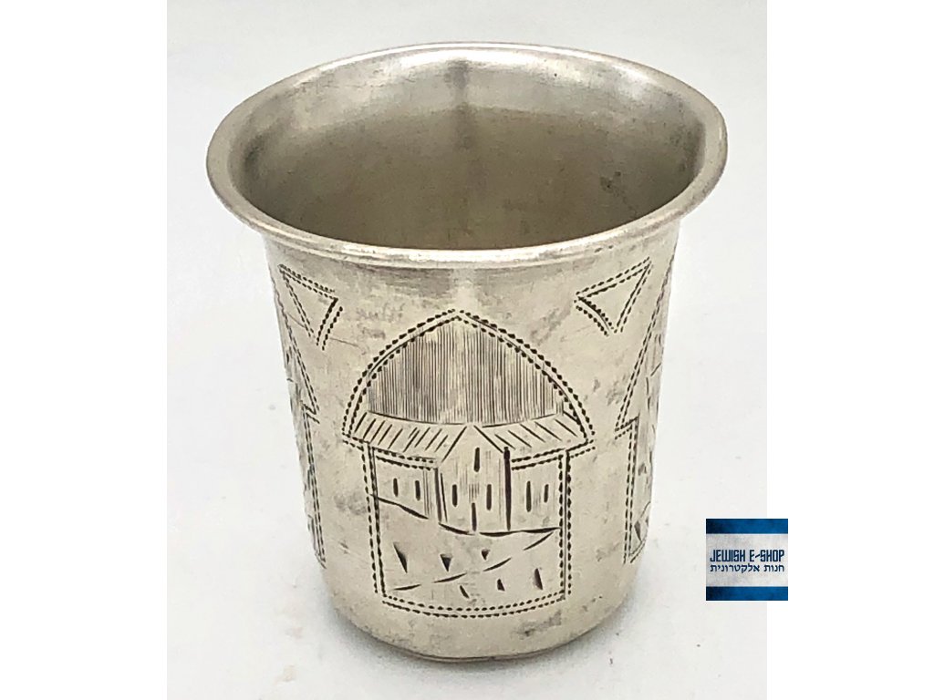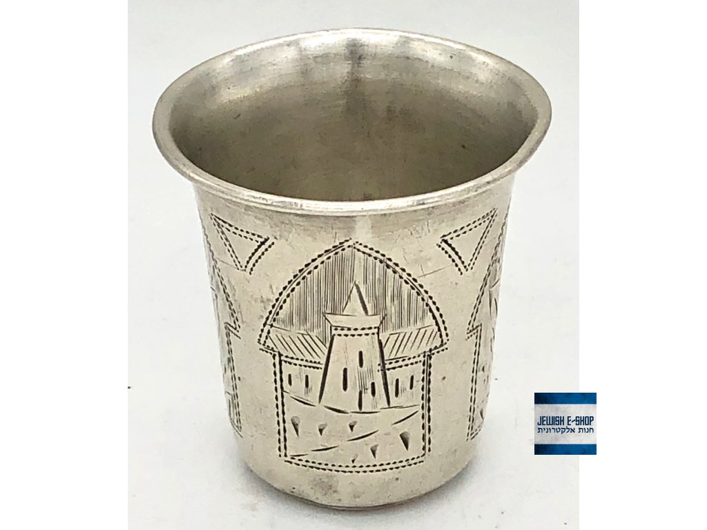 Ezüst kiddush csésze gravírozott díszítéssel.