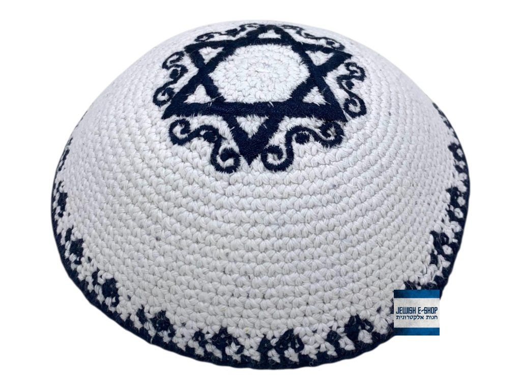 Bílá háčkovaná kippa s dekorovanou černou Davidovou hvězdou