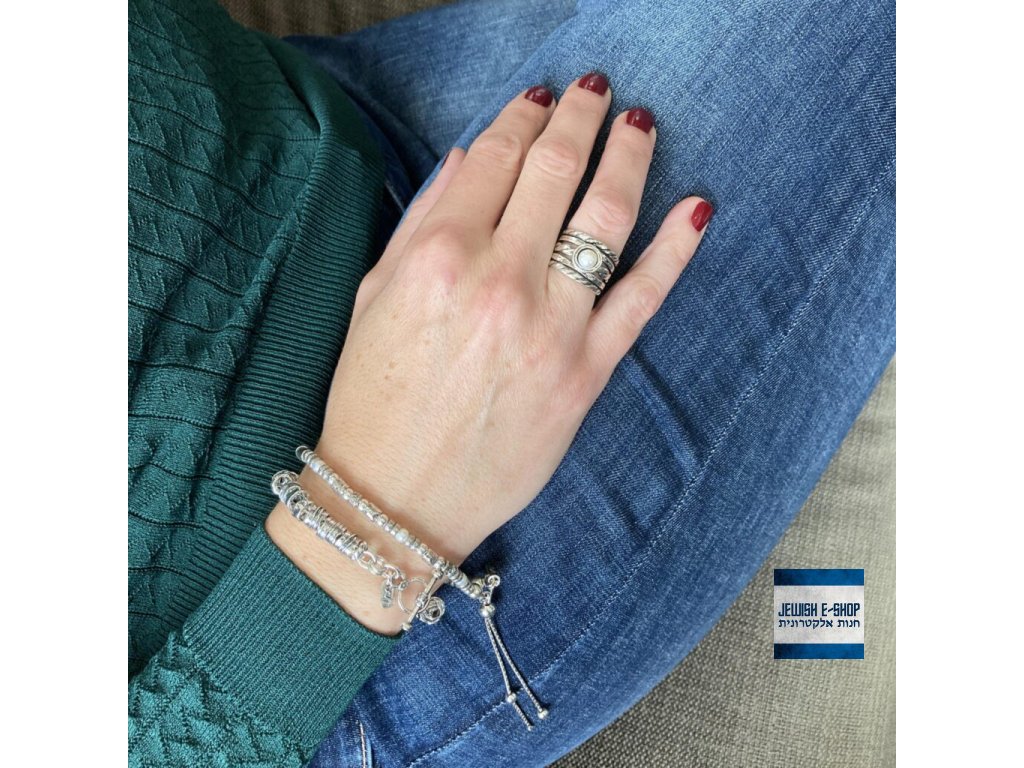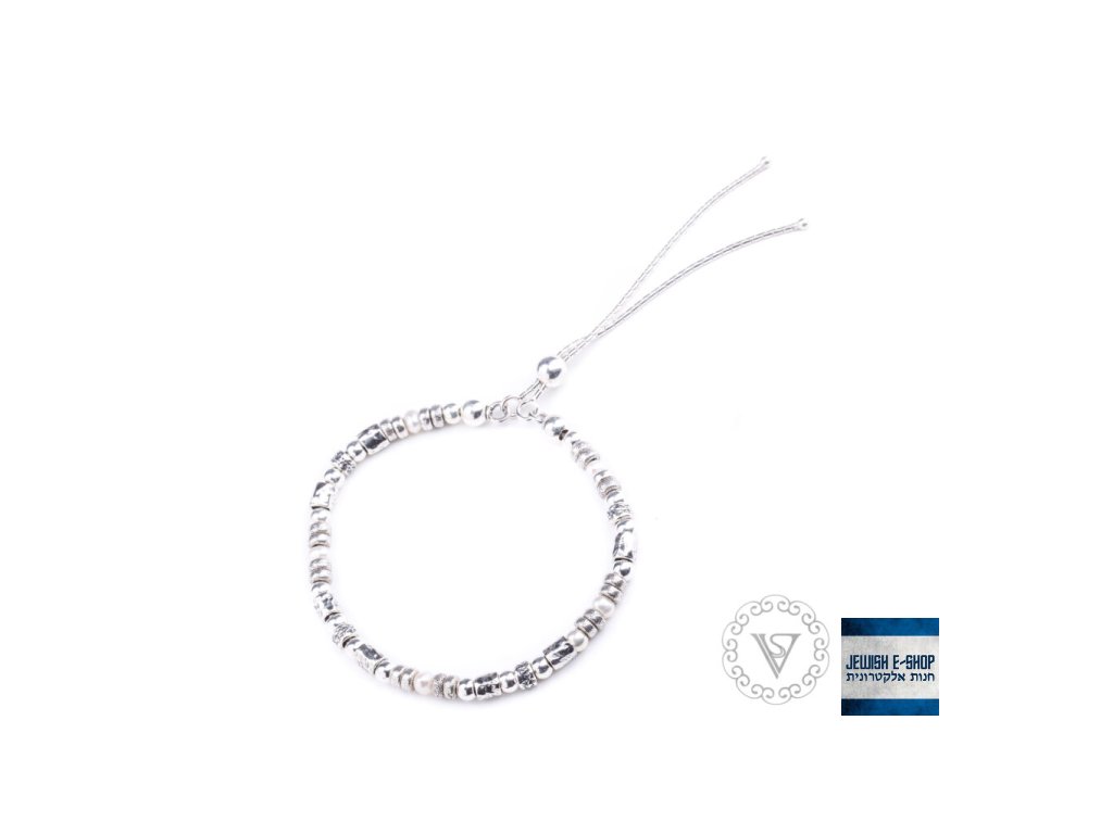 Jemný stříbrný náramek tvořený navlečenými jemně nepravidelnými perličkami bílé barvy a ozdobnými stříbrnými dílky. U zapínání náramku je drobný štítek s nápisem ISRAEL....