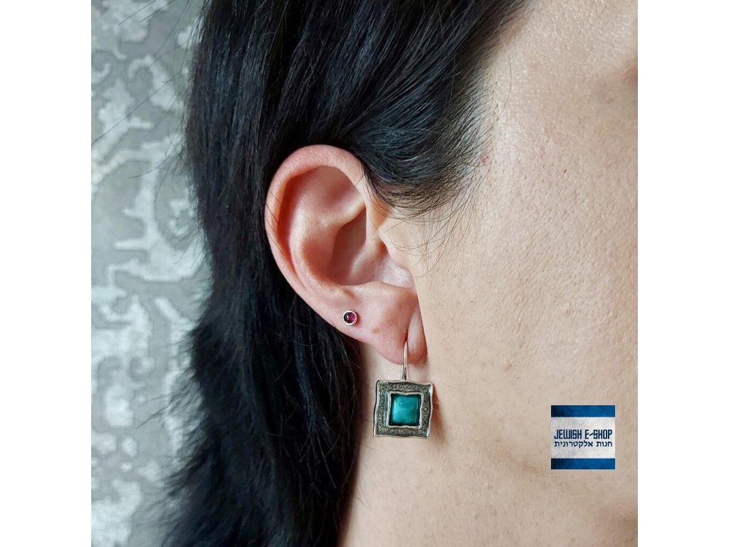 Drobné stříbrné náušnice - pecky - zdobené jedním čtvercovým kamenem. Zapínání na stříbrnou puzetku. Kámen: tyrkys - tmavě zelený přírodní kámen Rozměr náušnice: 5 mm x 5...