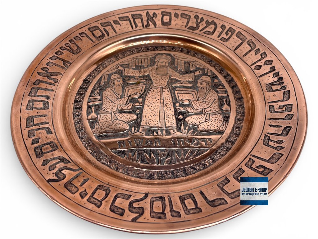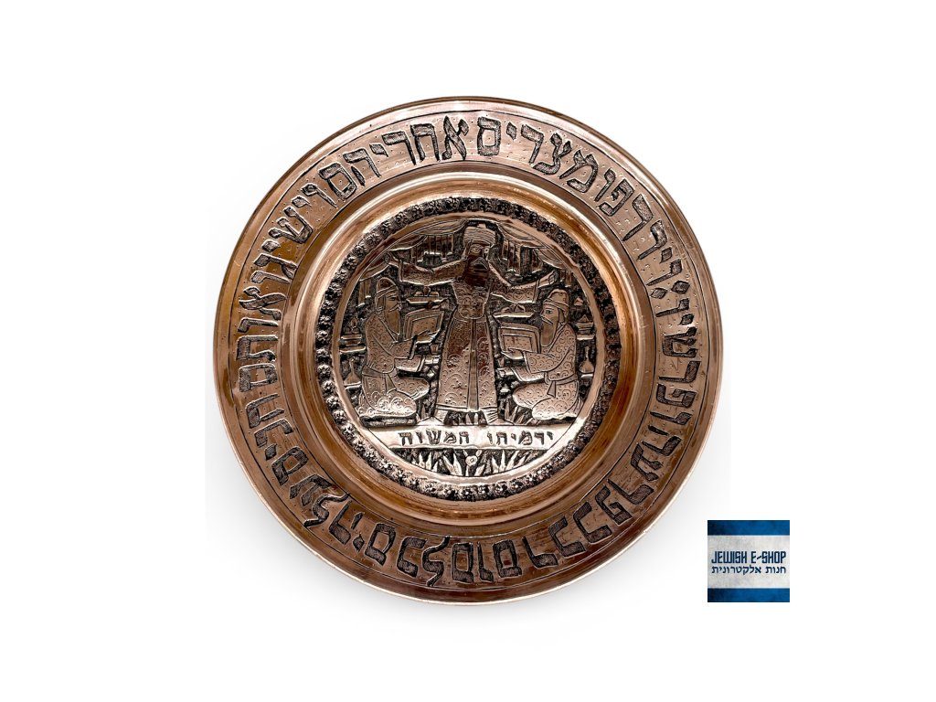 Měděný dekorativní talíř s pesachovými motivy a hebrejským citátem z Tóry po obvodu.