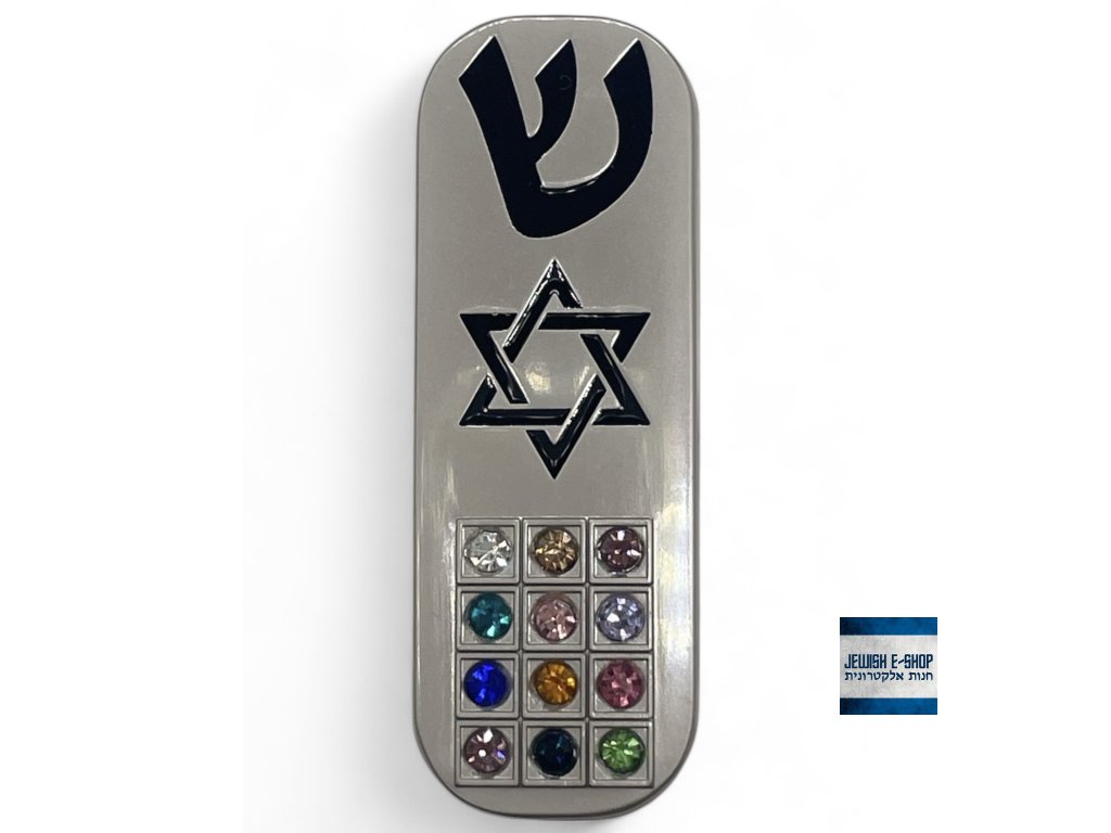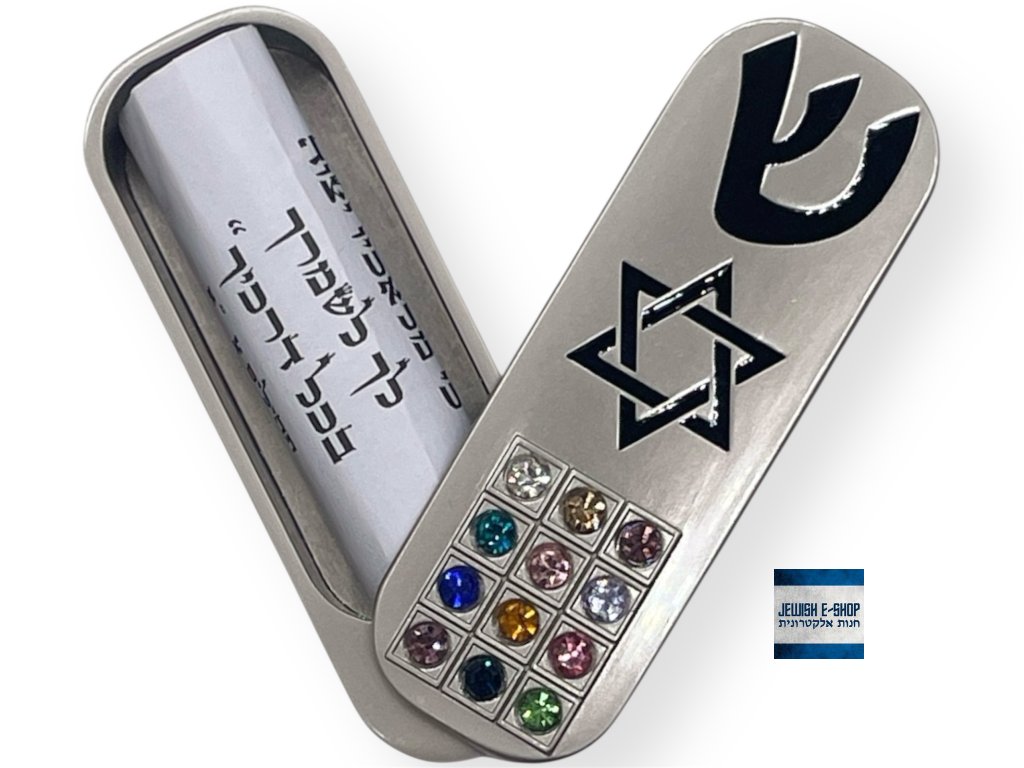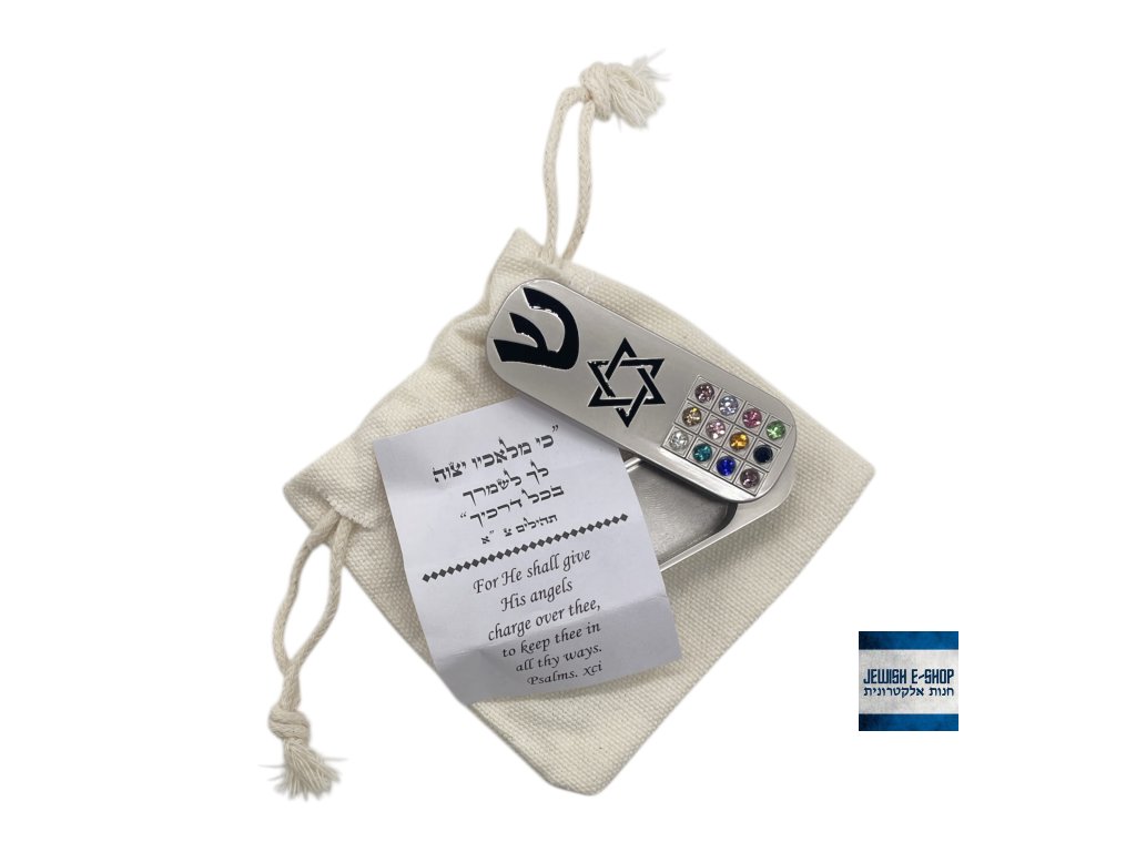 Kovová mezuza do auta s hebrejským písmenem "šin", Davidovou hvězdou a barevnými šatony, symbolizujícími 12 izraelských kmenů. Mezuza obsahuje papírový svitek s hebrejsky a anglicky psaným 11. veršem ze želmu 91. Mezuza má zespodu oboustrannou lepící pásku.